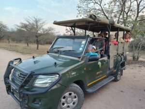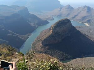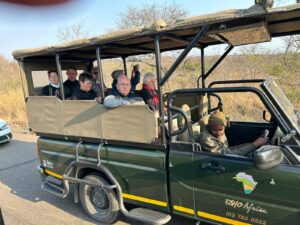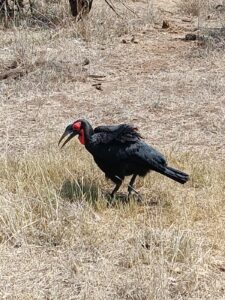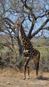 Bij een van de stops onderweg waren o.a. Struisvogels te zien. Uiteindelijk reden we de panorama route op en klommen we gestaag de bergen in waardoor het landschap ook veranderde. We zagen veel Eecalyptus bomen bedoeld voor de productie van papier en veel dennenbomen. Omdat iedereen deze dag voor zijn eigen lunch moest zorgen werd deze genuttigd gedurende onze rit. De eerste grote stop was bij de Drie rondavels. Dit gebergte ziet uit als traditionele woningen van vroeger gemaakt van leem. Even verderop bezochten we Burcks potholes; De natuur heeft hier een prachtige landschap achter gelaten en wordt jaarlijks door zowel Zuid-Afrikaanse alsook buitenlandse toeristen bezocht. Voordat we bij onze eindbestemming waren beklommen we ee stukje van het gebied van God’s window waar we met het mooie weer van deze dag een machtig uitzicht hadden op de vallei. Ooit is hier een film gedraaid waarbij een fles cola de vallei in werd geworpen. Uiteindelijk kwamen we bij schemering aan bij onze loge die in het Krugerpark zelf gelegen is. Een grote verrassing voor iedereen waren de Cabana’s waarin we de komende 3 nachten gingen logeren. Voorzien van airco en een mooie badkamer een verademing zo midden in de natuur. Na het diner in buffetvorm met wederom zeer vriendelijk personeel ging iedereen weer op tijd naar bed omdat morgenvroeg de eerste gamedrive met de eigen truck op het programma stond.