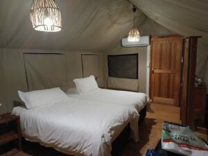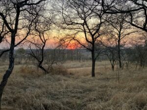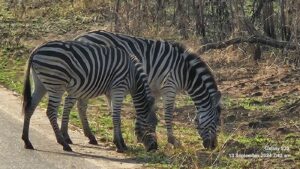 Na het ontbijt vertrokken we om 7.00 uur richting Eswatini. Een rit van 270 kilometer vandaag. Onderweg zagen we hoe gemakkelijk mensen hun afval nog langs de doorgaande weg dumpen. Vooral de groene flesjes van een bekend Nederlands biermerk voerden de boventoon. Tijdens door de diverse dorpen onderweg zagen we grote verschillen in hoe de mensen gehuisvest waren. Afhankelijk van enige industrie kon je zien dat er op sommige plekken meer welvaart was. Ook nu weer enorme oppervlaktes vol met Eucalypyus bomen voor de papierindustrie, maar ook bananen en ander citrusvrucht waren in beeld. Langzamerhand richting Eswatini ook steeds meer suikerriet. Wetende dat van elke 100 kg suikerriet maar 10 kilo echter suiker geproduceerd kan worden. We klommen steeds hoger tot ongeveer 700 meter en bereikten de grens waar het op deze zondag erg rustig was. Met een tweetal stempels in onze paspoorten bent sommigen met condooms in diverse smaken op zaken reden we het land van de koning met zijn 14 vrouwen en ongeveer 1,2 miljoen inwoners binnen. Even later stoppen we bij een glasfabriek waar kunstglas gemaakt werden. Hier werd de eerste openlucht lunch voorbereid terwijl de gasten de winkel en winkeltjes konden bezoeken. Nadat alles weer ingeladen was reden we een uurtje later het Mlilwane natuurreservaat binnen. Vandaag een Eswatini massage over een hobbelend pad met onderweg al veel dieren in beeld en prachtig bloeiende Jacaranda bomen en een enorme termietenheuvel. Iedereen was totaal verrast toen ze hun onderkomen zagen voor deze nacht. Slapen in een enorme bijenkorf! Ook de omgeving waar impala’s zo tussen ons rondliepen evenals Pumba’s. Ondertussen werd er behulp van een aantal gasten het avondeten bereid. Deze keer heerlijk verse aardappelsoep en chicken al la king met als toetje een ijsje. OOk alle handen uit de mouwen voor de afwas.
