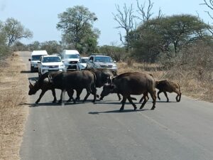 Het was zeker geen ongeluksdag want nadat we om 7.00 uur richting een van de poorten van het park reden was het geluk aan onze kant. Terwijl Shaun heel veel vertelde over het dierenleven in dit immense park net zo groot als de helft van Nederland zagen we de eerste Impala’s al. Gedurende de dag werd er regelmatig groot en klein wild gespot met o.a. Olifanten, Giraffes, Wildebeesten, Springbokken, krokodillen en ook veel verschillende vogels. In de namiddag troffen we het een kudde van enkele hinderden buffels aan te treffen die de weg overstaken. Ook de Koedoes, Zebra’s waren goed actief. Na dit avontuur terug naar de logge waar menigeen nog een duik nam in het mooie zwembad. Als verrassing was er in de avond een braai in de openlucht in een kraal direct naast het binnen restaurant. Aan het einde was er nog een optreden van het personeel van de logge. Een enkeling waagde het om ook mee te dansen.